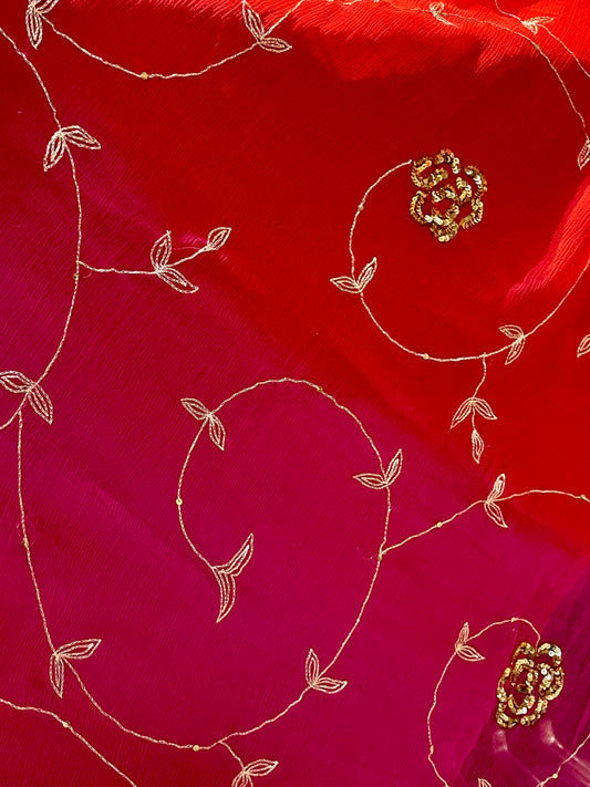 Crimson Blossom Chiffon Saree in Red-Rani Ombre with Kasab Jaal & Sequin Floral Embroidery