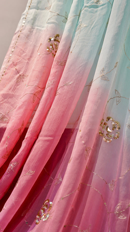 Celestial Cascade Chiffon Saree in Blue-Pink Ombre with Kasab Jaal & Sequin Floral Motifs